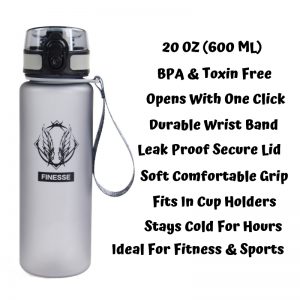 The Finesse logo symbolizes good fortune and success on any journey you set forth in. Not only does it have a sleek design with superior functionality, it’s BPA free, leak proof, opens with one click, and comes with a wrist band!